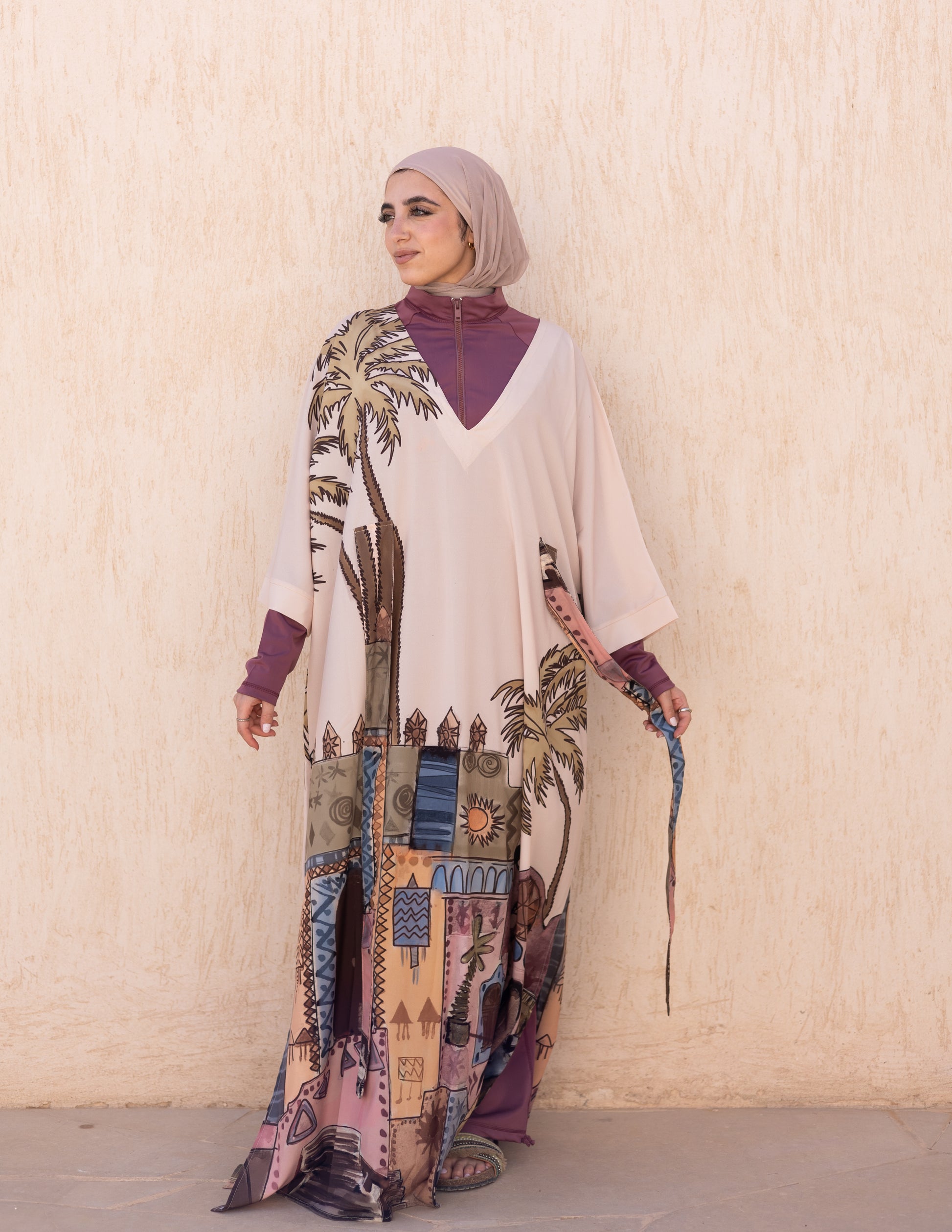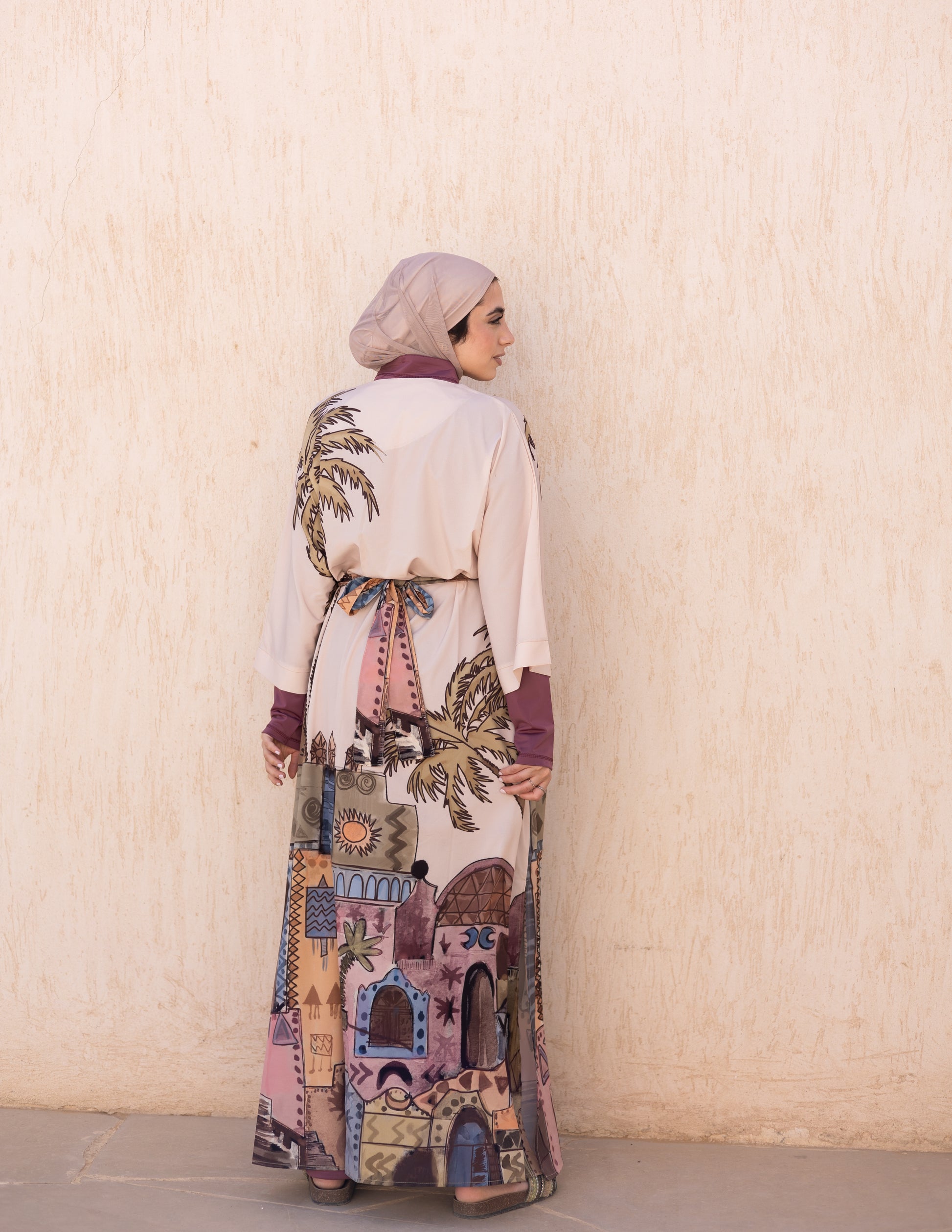 Designed with a flowy modest silhouette, the dress can be styled in multiple ways, offering versatility while maintaining effortless elegance. Lightweight and expressive, it blends art, culture, and contemporary modest fashion.